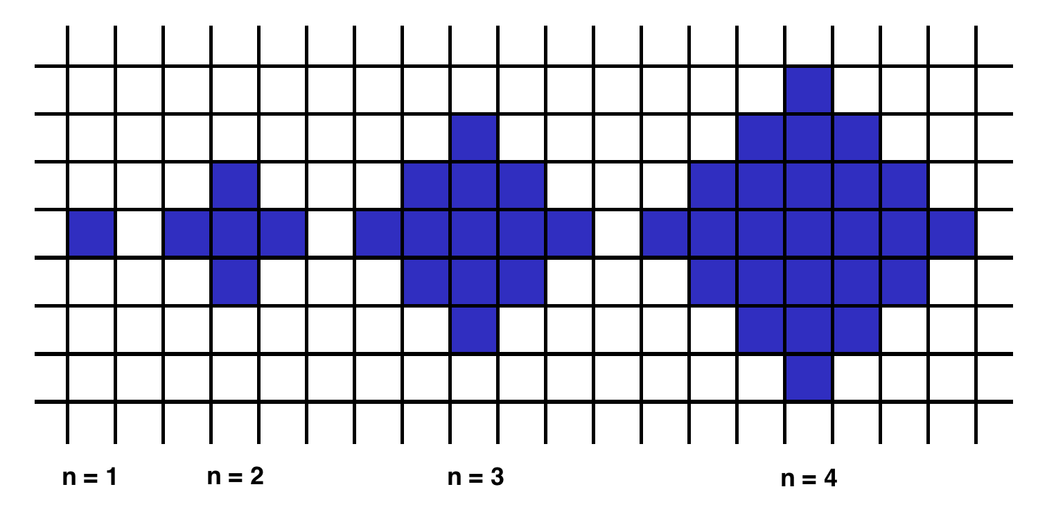 A 1-interesting polygon is just a square with a side of length 1. An n-interesting polygon is obtained by taking the n - 1-interesting polygon and appending 1-interesting polygons to its rim, side by side. You can see the 1-, 2-, 3- and 4-interesting polygons in the picture below.